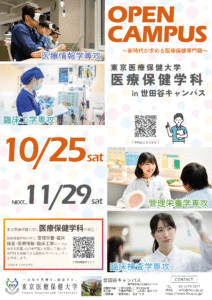今回のイベントは専攻毎に企画を用意しており、専攻説明、入試説明、模擬授業など盛りだくさん。医療系の学びに興味がある方、管理栄養士、臨床検査技師、医療情報技師、臨床工学技士などを志望している方、どんな方でも、どうぞお気軽にご参加ください!
