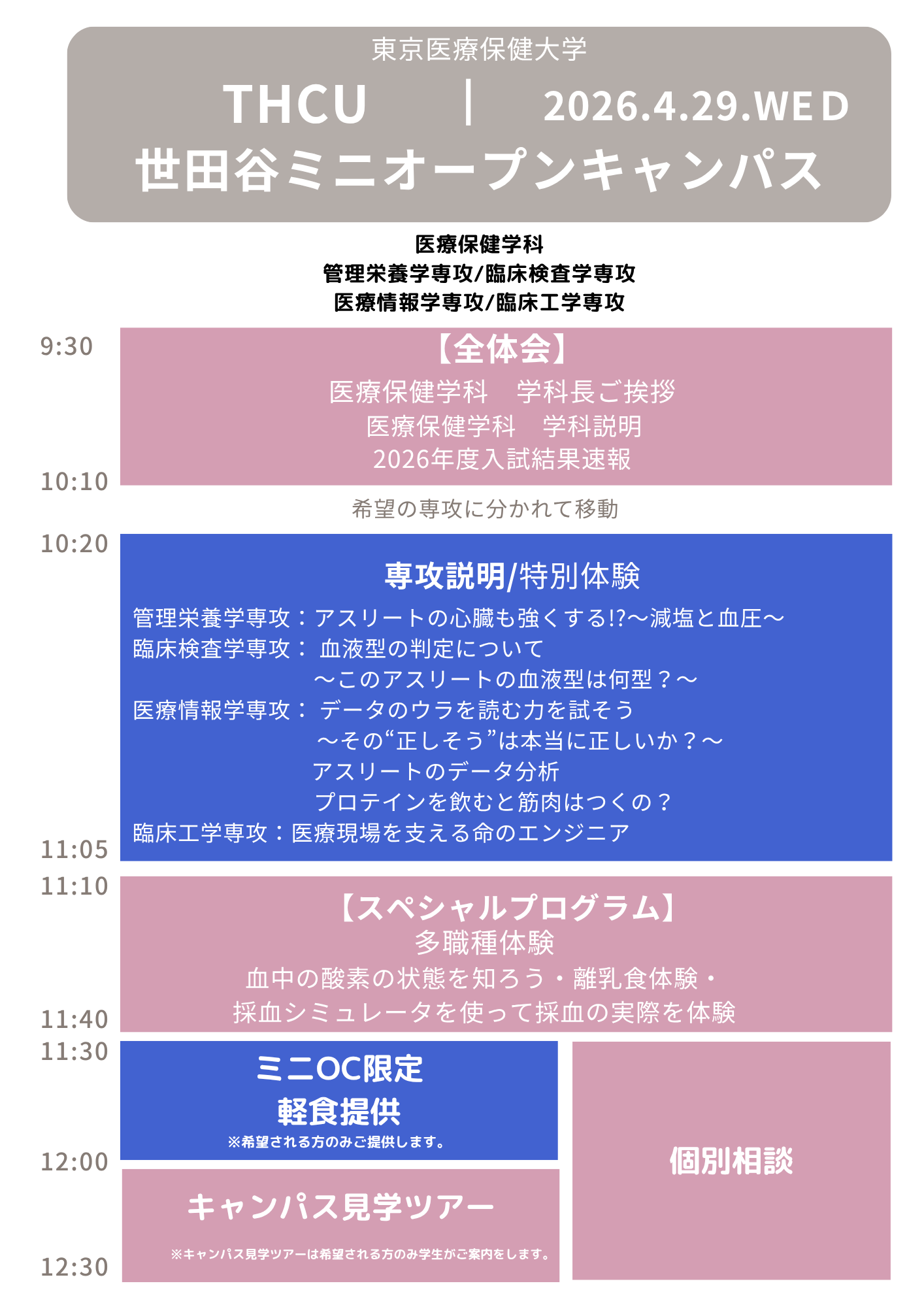 今回のイベントは専攻毎に企画を用意しており、専攻説明、入試説明、模擬授業など盛りだくさん。医療系の学びに興味がある方、管理栄養士、臨床検査技師、医療情報技師、臨床工学技士などを志望している方、どんな方でも、どうぞお気軽にご参加ください!